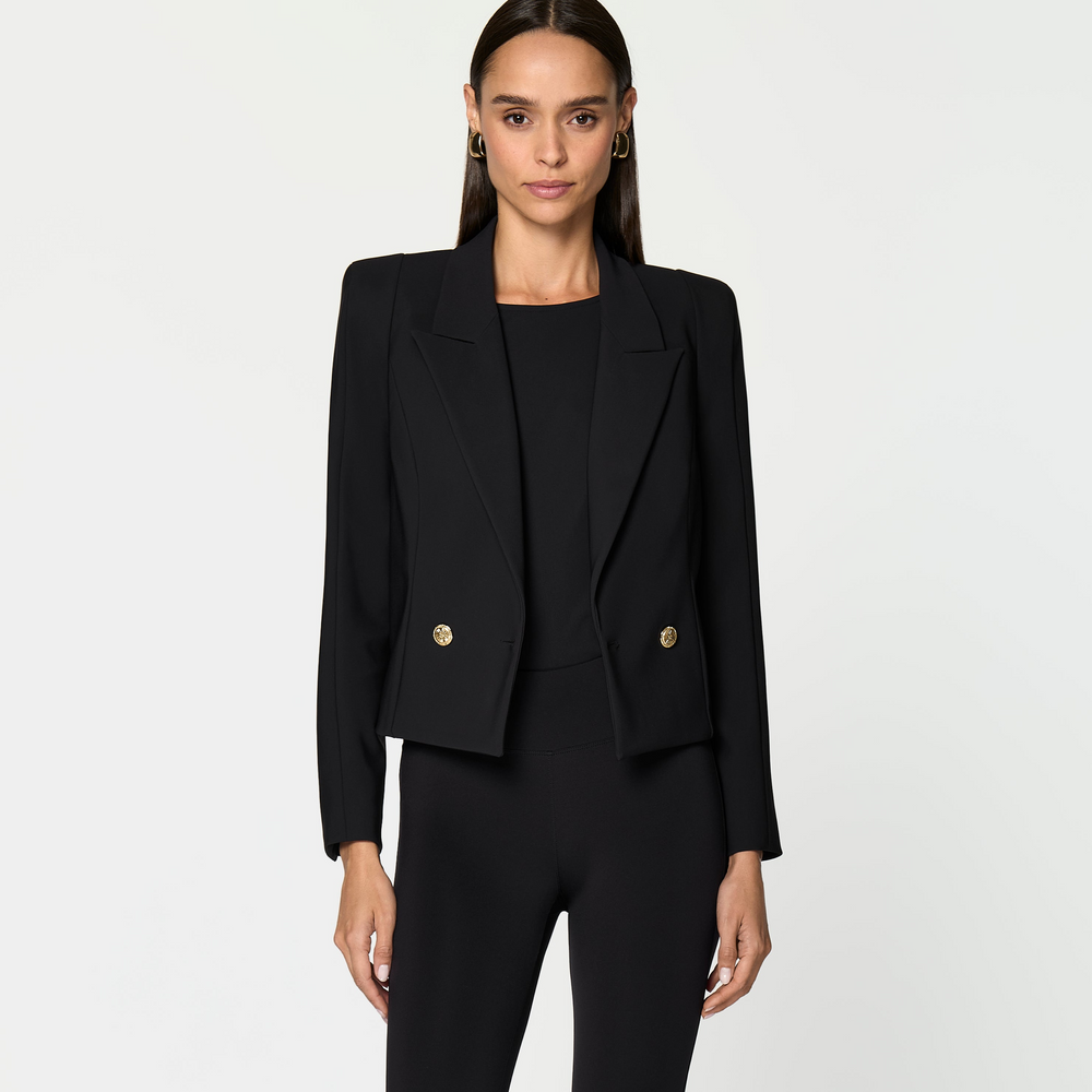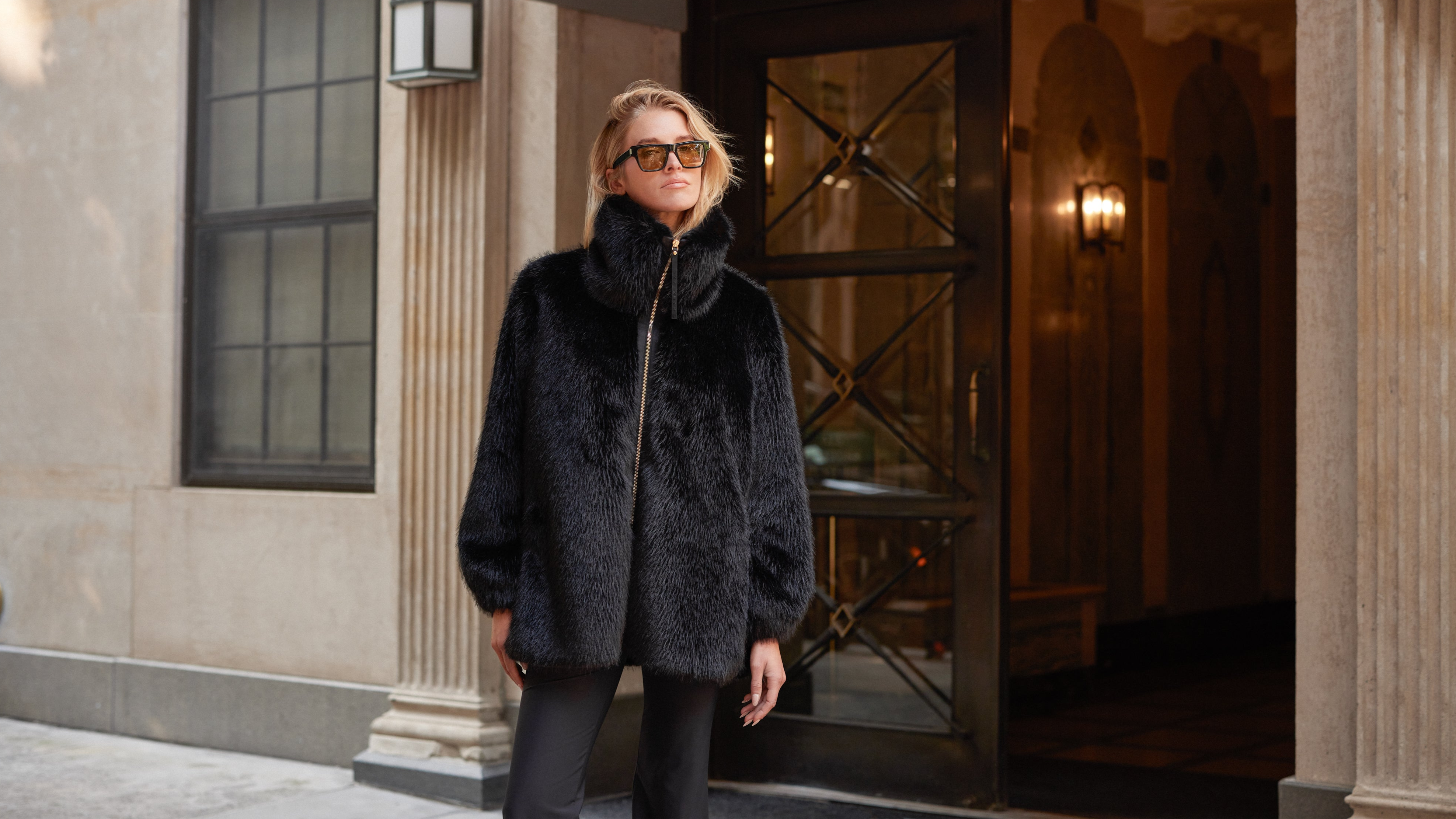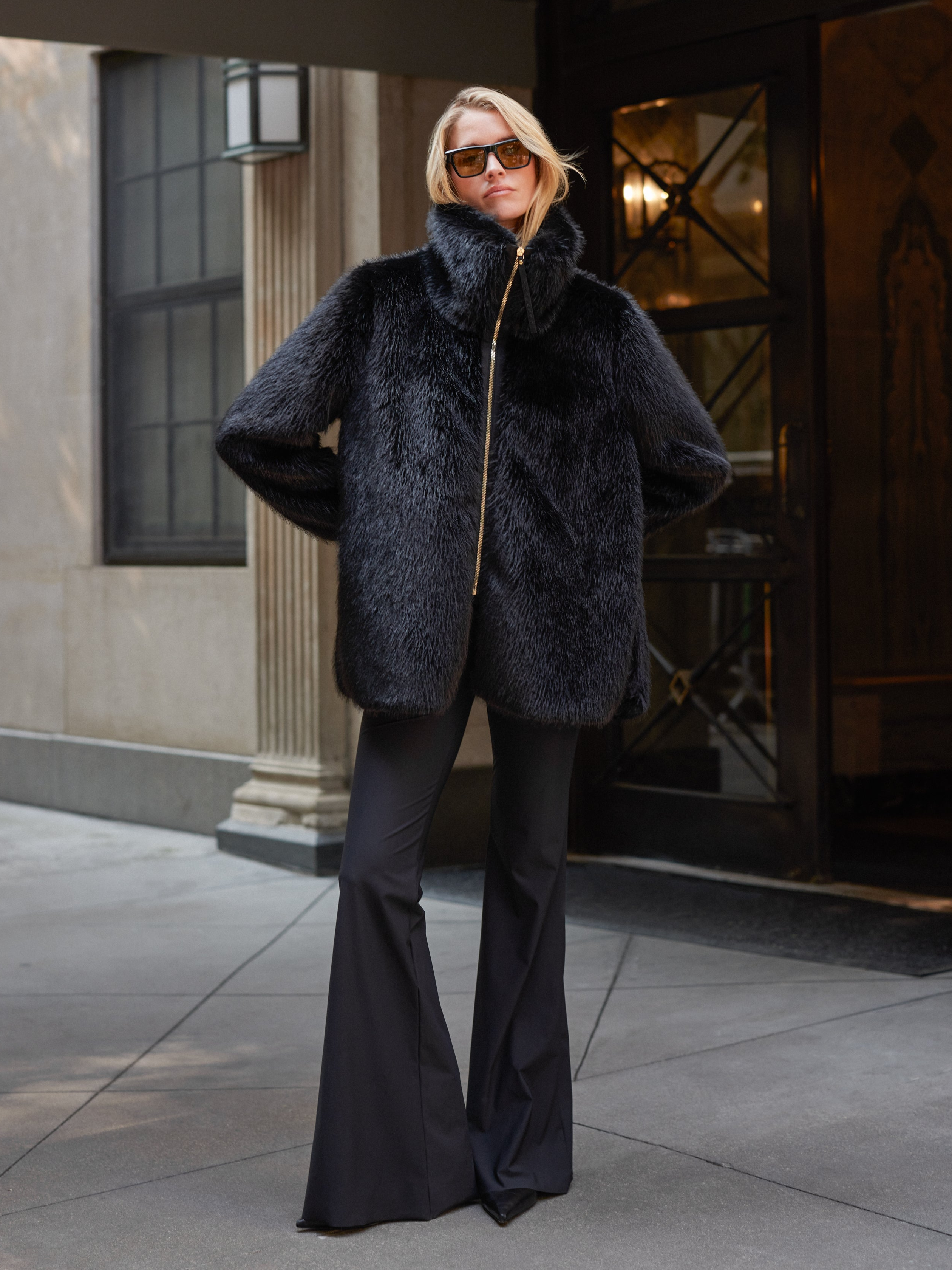 This statement coat in sumptuous black faux fur features a sculpted high neck, graceful side slits, and gold-accented details. Luxe warmth, enduring style, designed for the city.