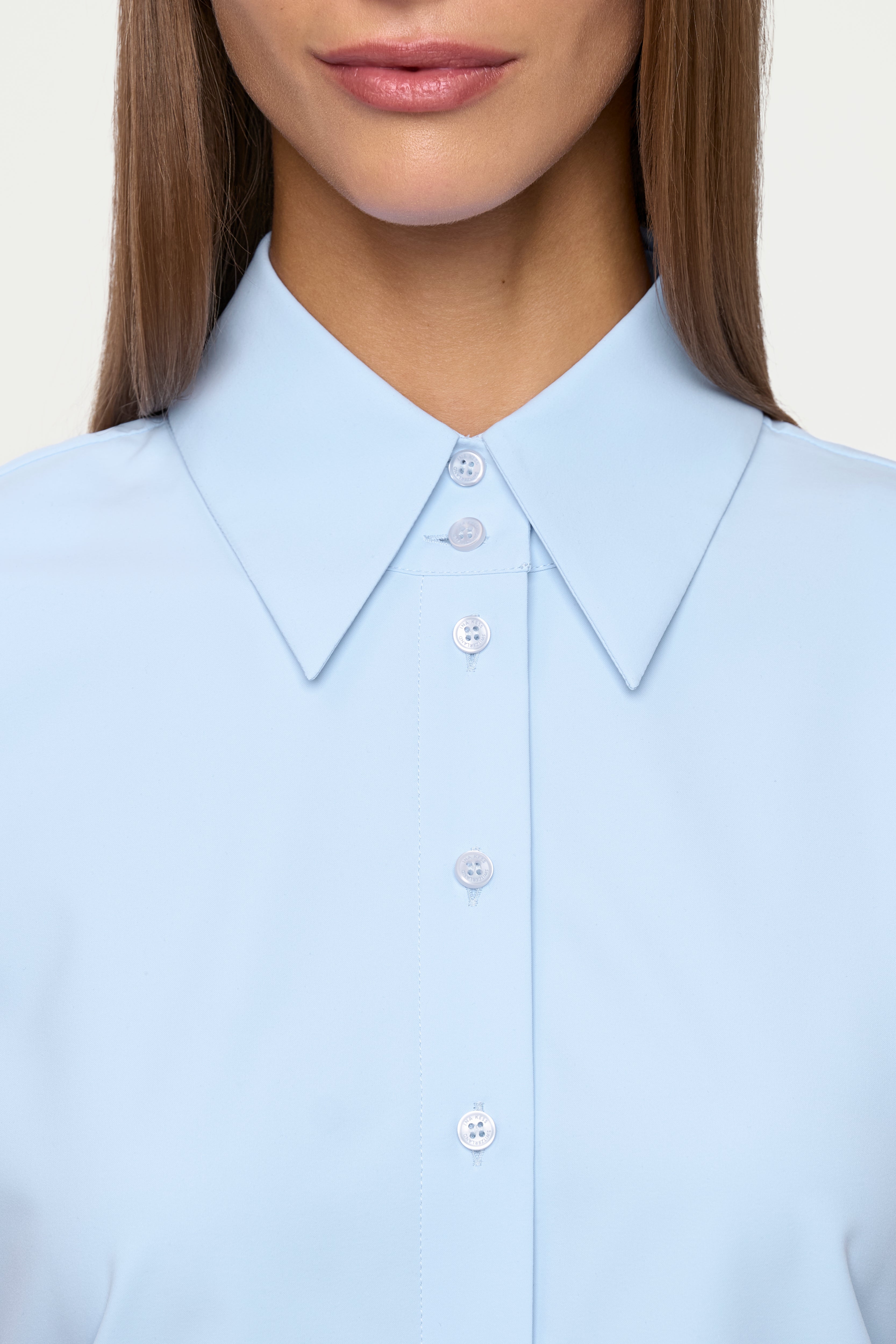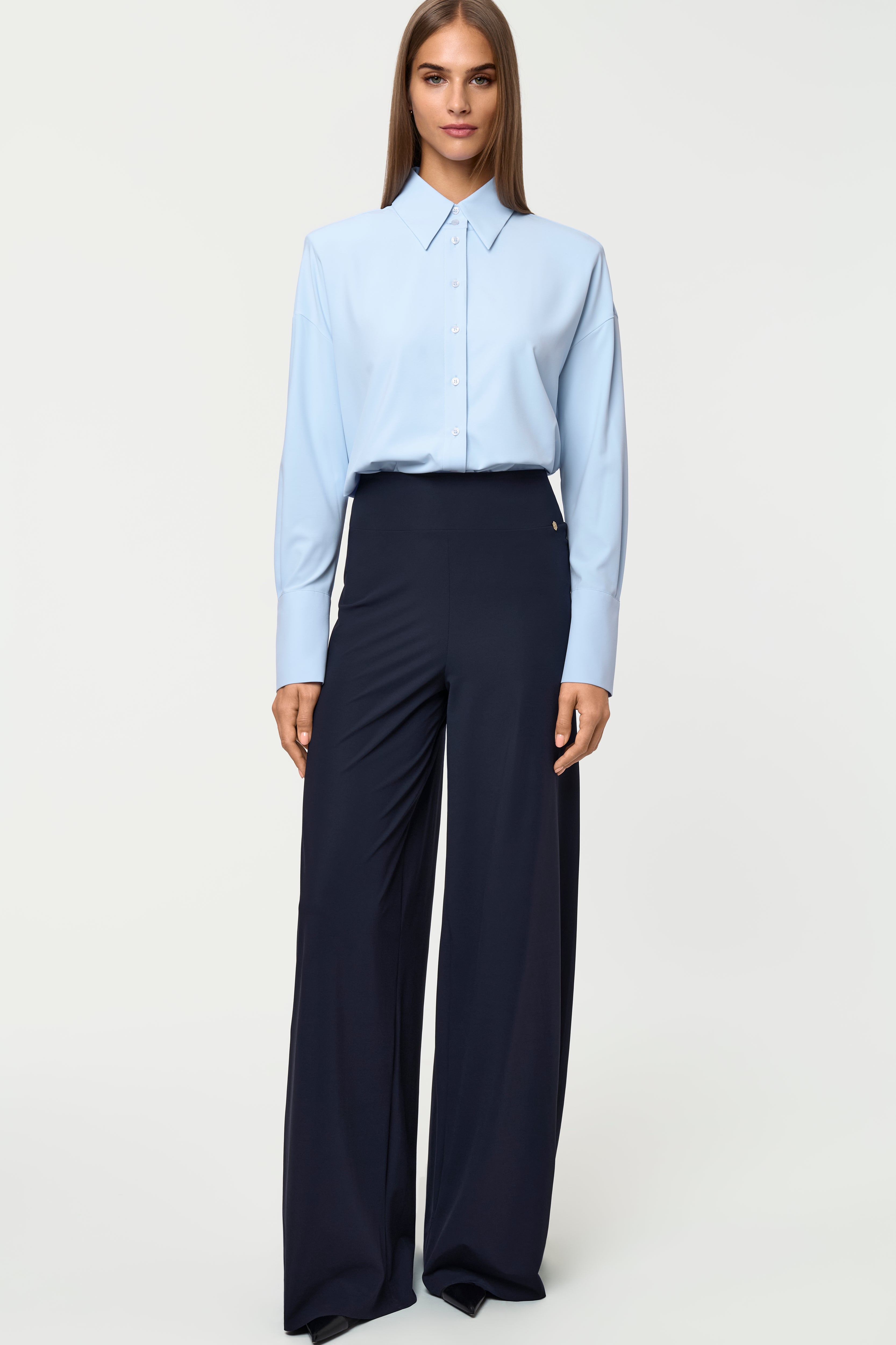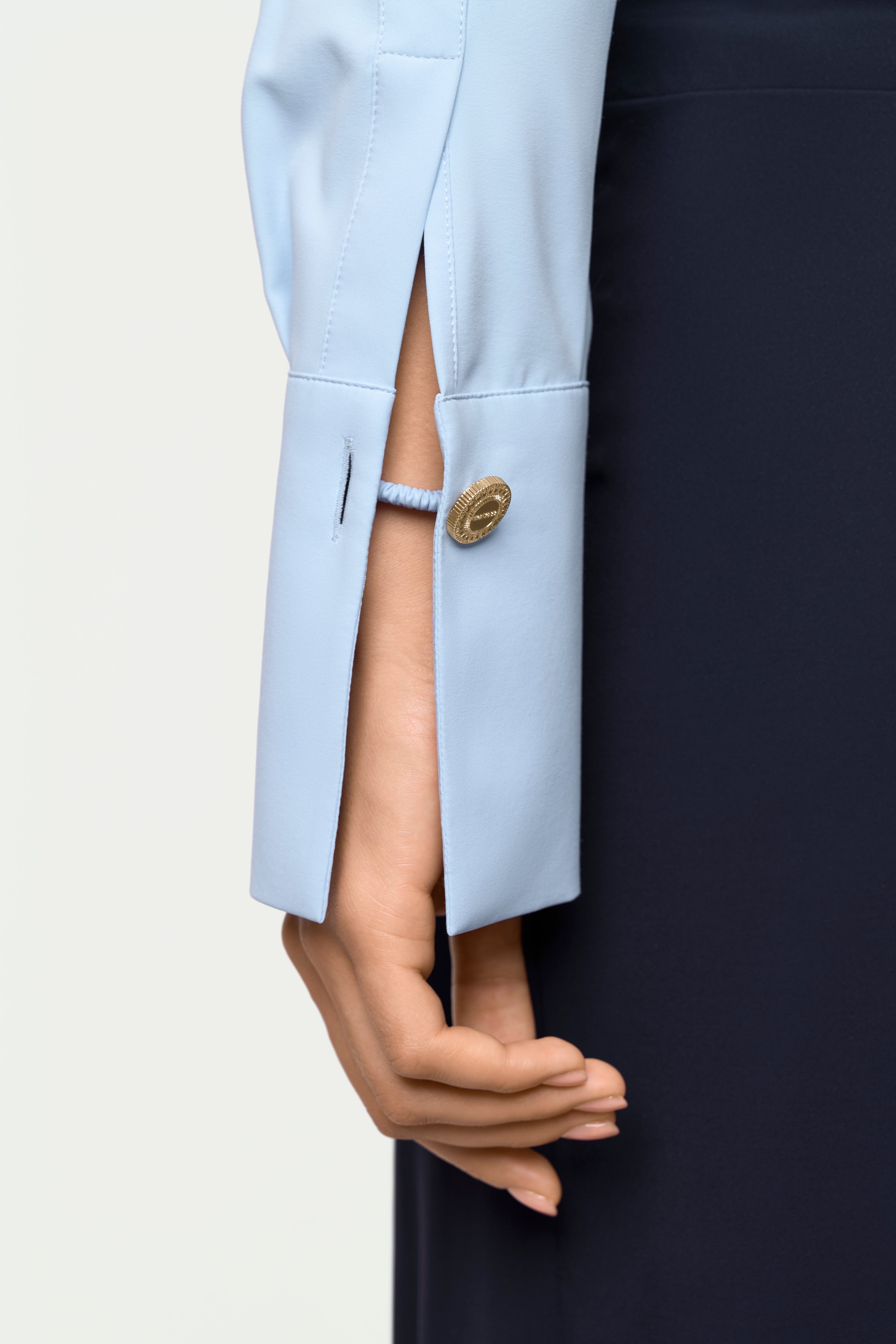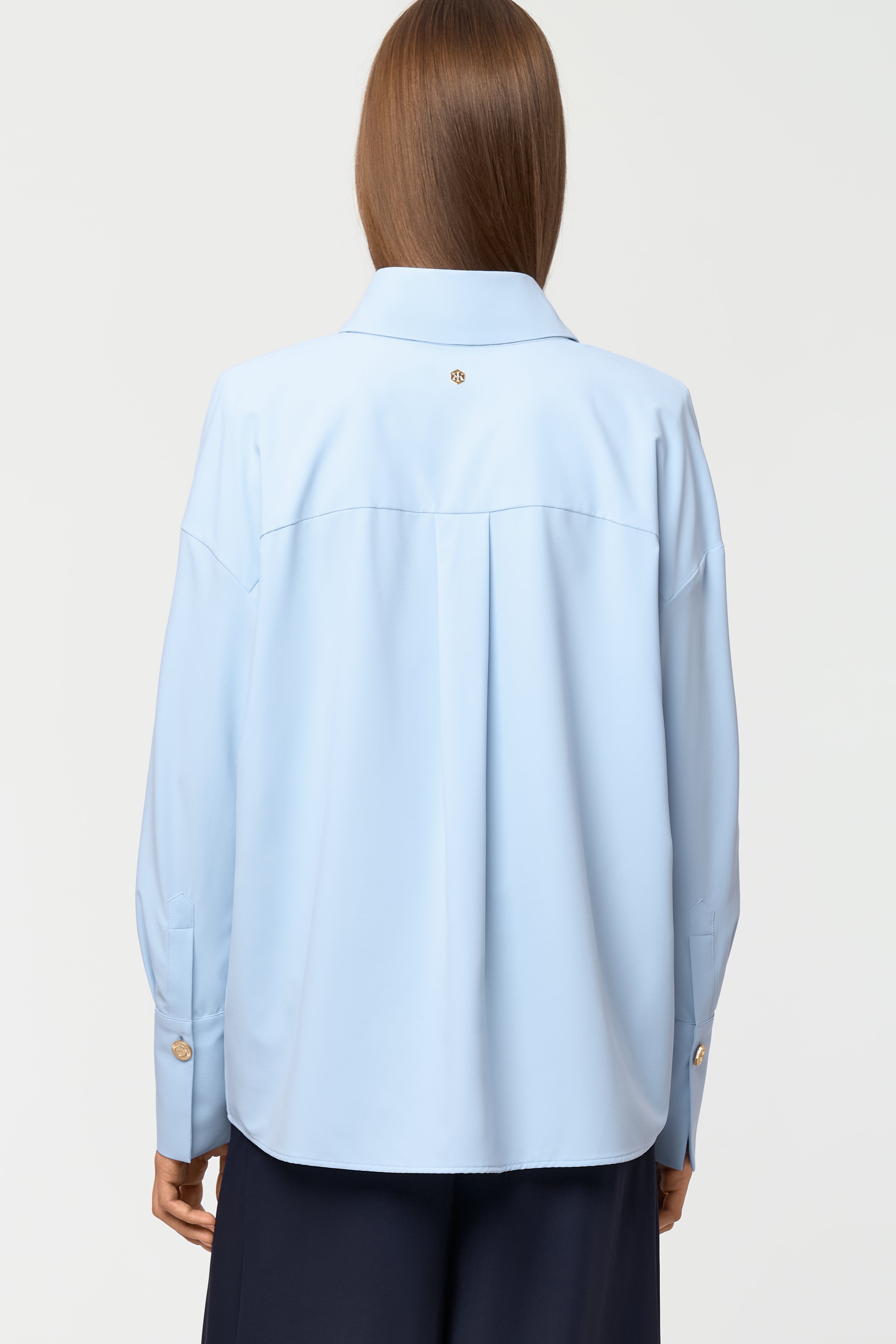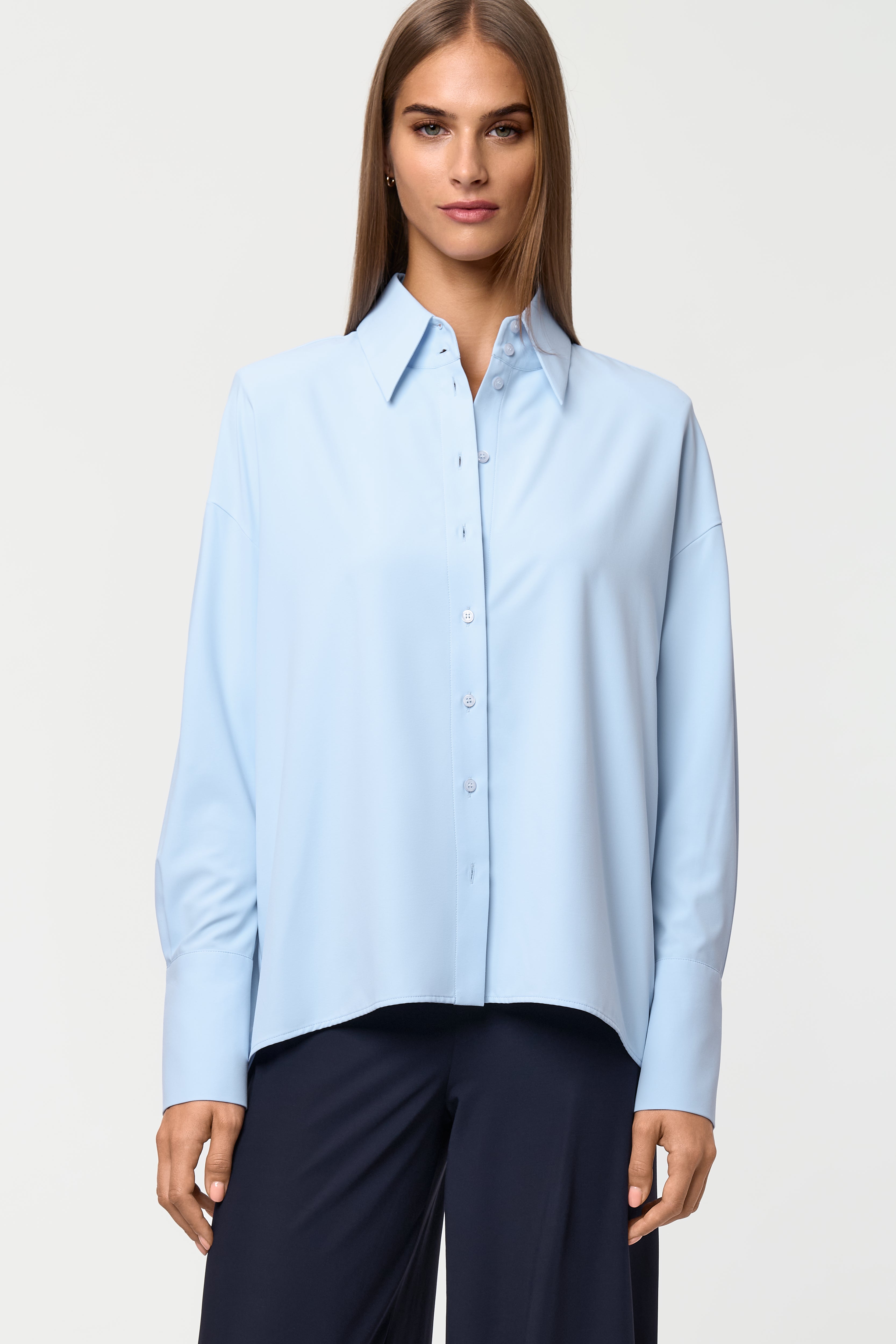 The LAREGIA Shirt in breathable X10 fabric offers effortless comfort in refined chambray. Its short, boxy fit and front panel create a modern, effortless silhouette, while removable shoulder pads allow subtle shaping. A stand collar and tonal button placket give a polished finish, and elastic cuffs let you push the sleeves up neatly. A subtle white INA KESS print on the back adds a distinctive touch. Pair it with the SINAM Pants deep navy for a perfect look.