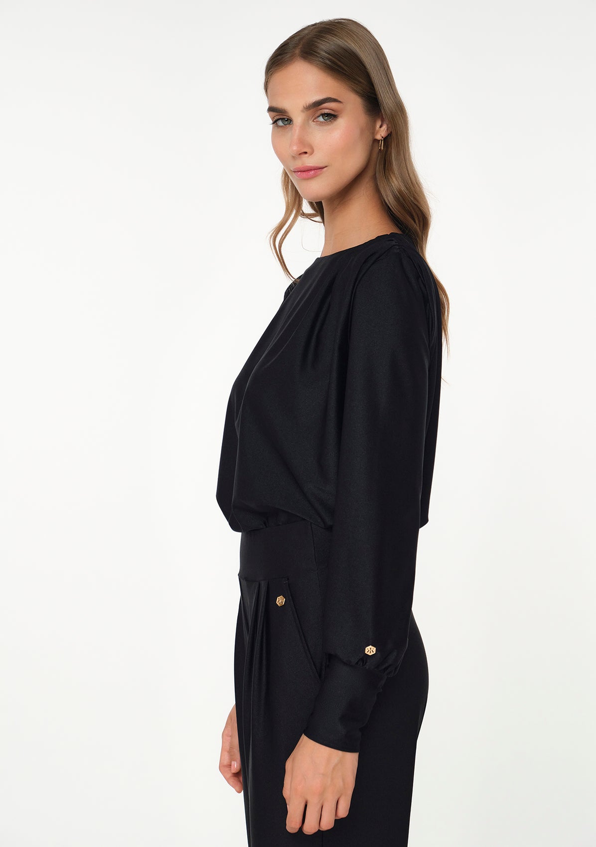 The PECUNIA Blouse in black is the perfect sophisticated party top. The shimmering functional material is breathable and feels incredibly soft and lightweight on the skin. The blouse features delicate shoulder pads and gathered sleeves for an extra dose of glamour. Combine this top with the AURA Stretch Pants for the ultimate jumpsuit dress code.