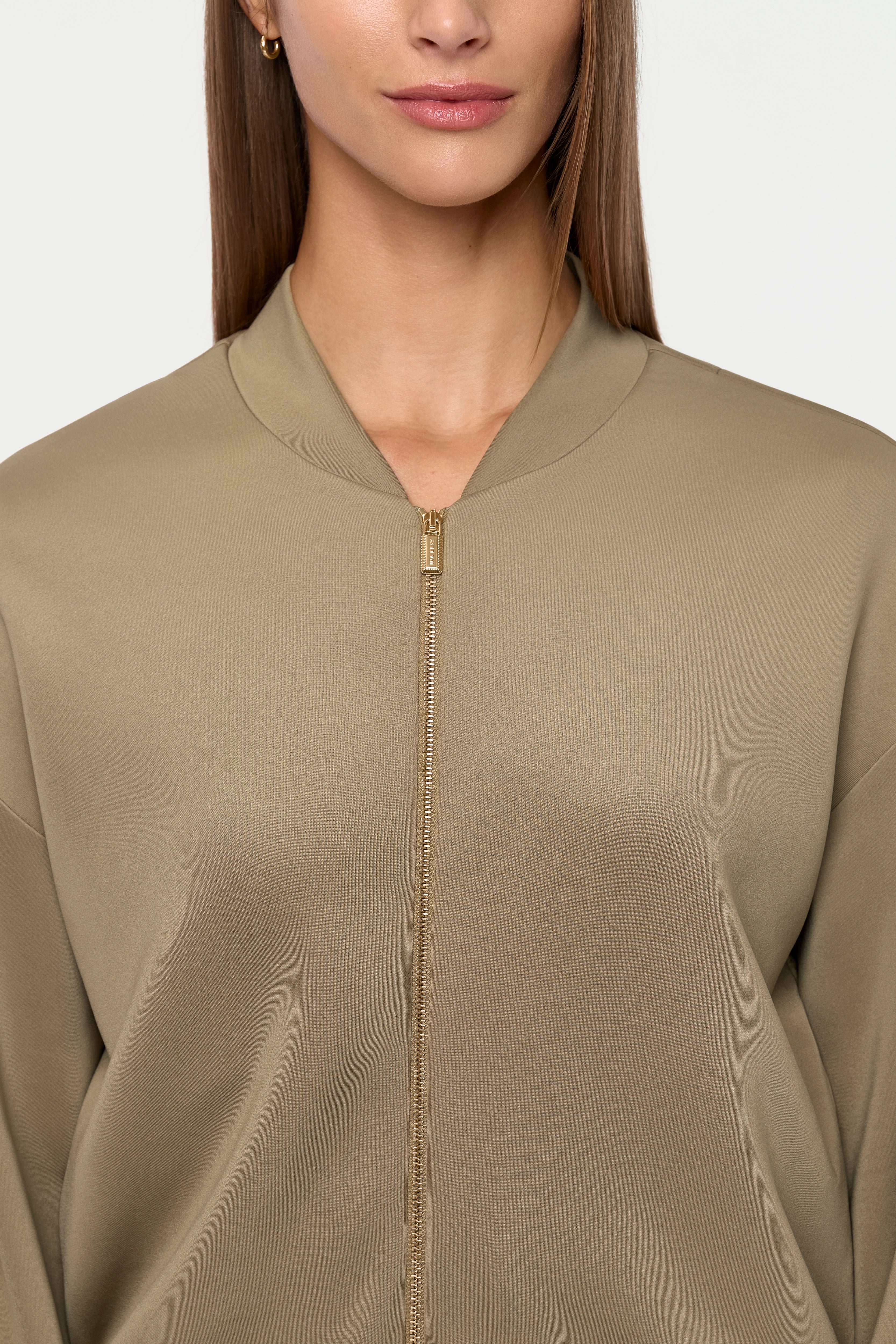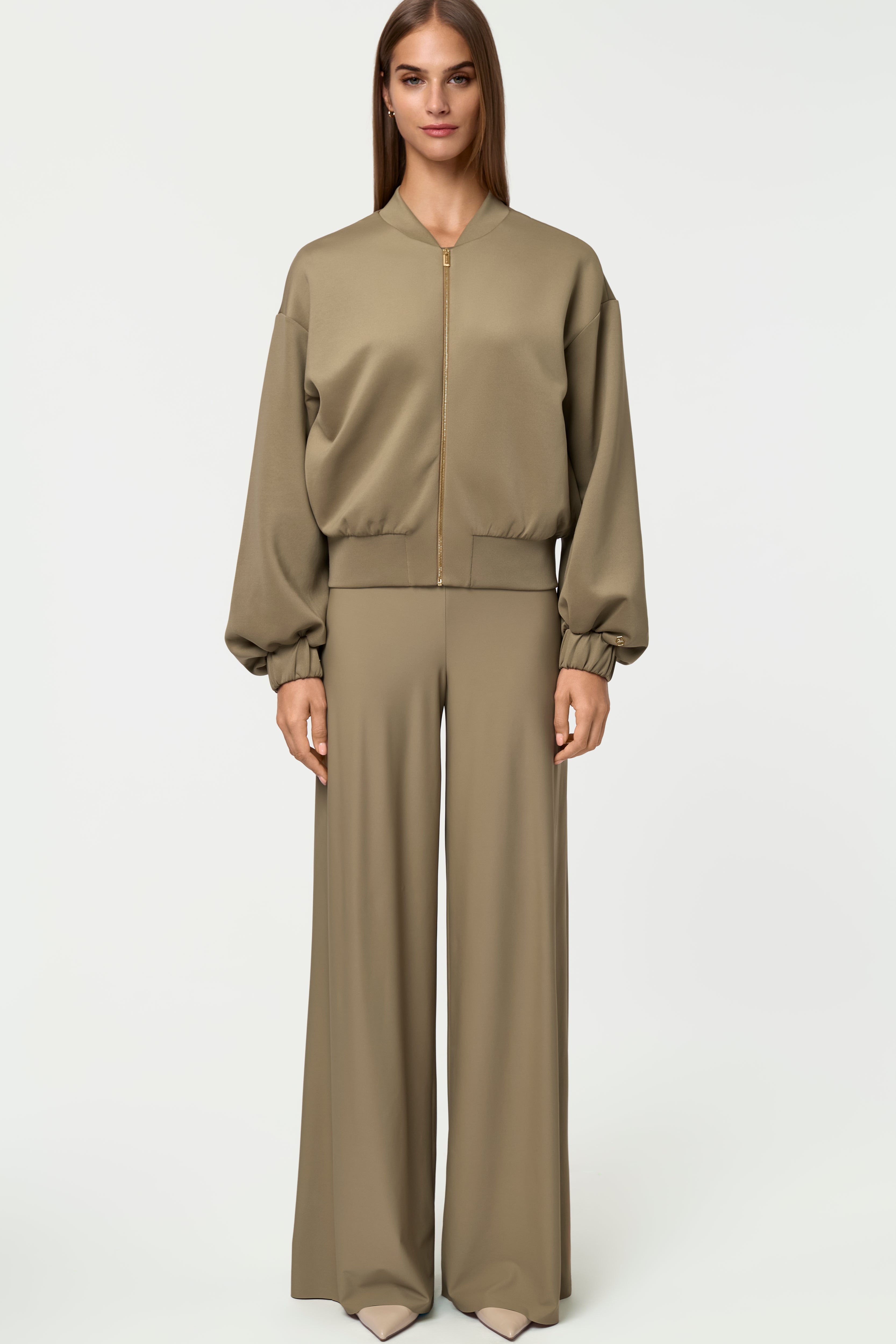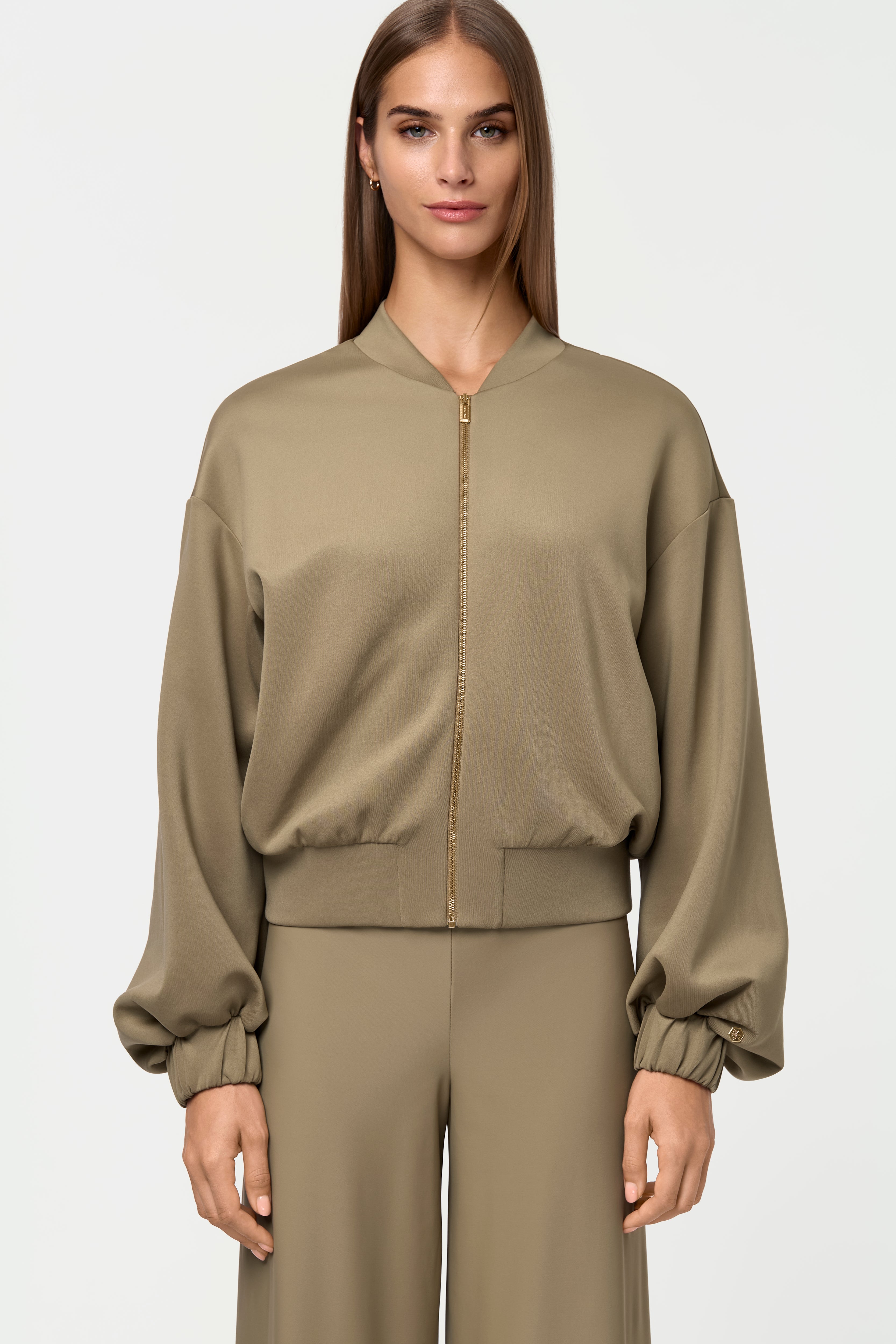 The SABIA Cardigan crafted from soft Italian SCUBADINE feels incredibly comfortable and looks effortlessly chic. It features a rounded neckline, a flat stand collar, dropped shoulders, and balloon sleeves with gathered cuffs. Side pockets add function, with a hidden zip on the right for secure storage. A golden INA KESS front zipper and metallic logo detail finish the look. Pair it with the ODIL T-Shirt or the SINAM Pants oliva for a refined match.